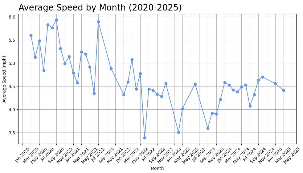 2020 saw the most miles run (likely due to COVID) and the highest speeds. Meanwhile, 2023 saw